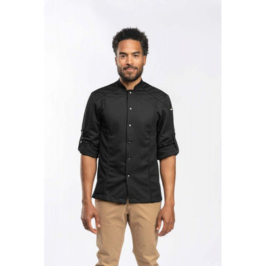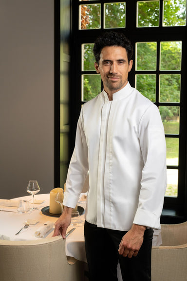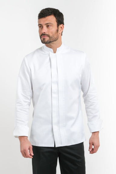 Men's kitchen jacket. Stand-up collar and inside in terry-towelling. Snap buttons concealed under placket. Long sleeves with cuffs. Flat pleats on ...
