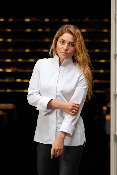Women's chef jacket. High neck. 7/8 length sleeve with turnbacks at cuffs. Concealed press-stud placked. Small pockets at back. Length 70 cm