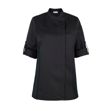 Female chef jacket. Contrasting stitching trimming. Officer collar. Press stud buttons. 1 press-stud chest pocket. Transformable sleeves. Turnback ...
