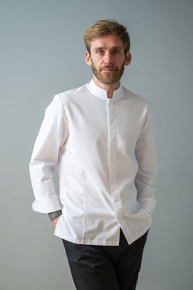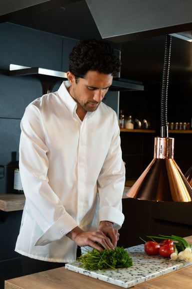 Men's chef jacket. Mandarin collar. Long sleeves. Pen pocket. Side vents. Side slits. Concealed press-stud placked. Underarm air vents.