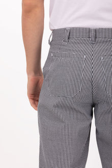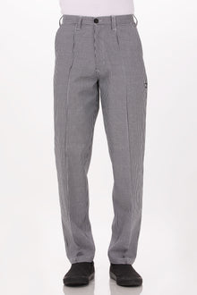 Available in black or small check 65% Polyester, 35% Cotton Yarn-Dyed Blend 6.2 oz. Front seams Zipper fly Button closure Belt loops Two side-seam...