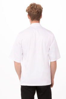Available in white only 100% Cotton 5.2 oz. Cool Vent side panels with side-seam slits Short sleeves Single-breasted with zipper closure Ba...