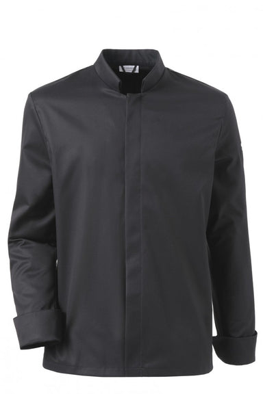 Men’s fitted kitchen jacket. Color: Black; White Material: Polyester/Lyocell Short collar. Press-stud closure down the middle in front. Breast po...