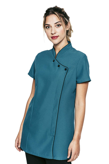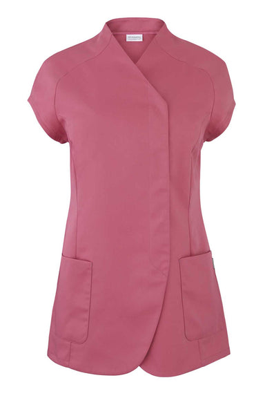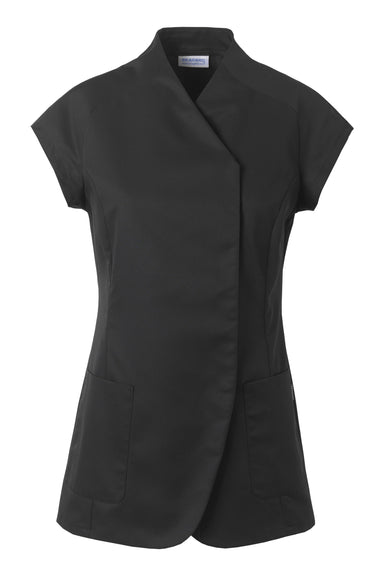 Ladies asymmetrical tunic. Short sleeves fitted standcollar front side button fastening 2 side pockets Side slits Comfort pleat in back armhole in ...