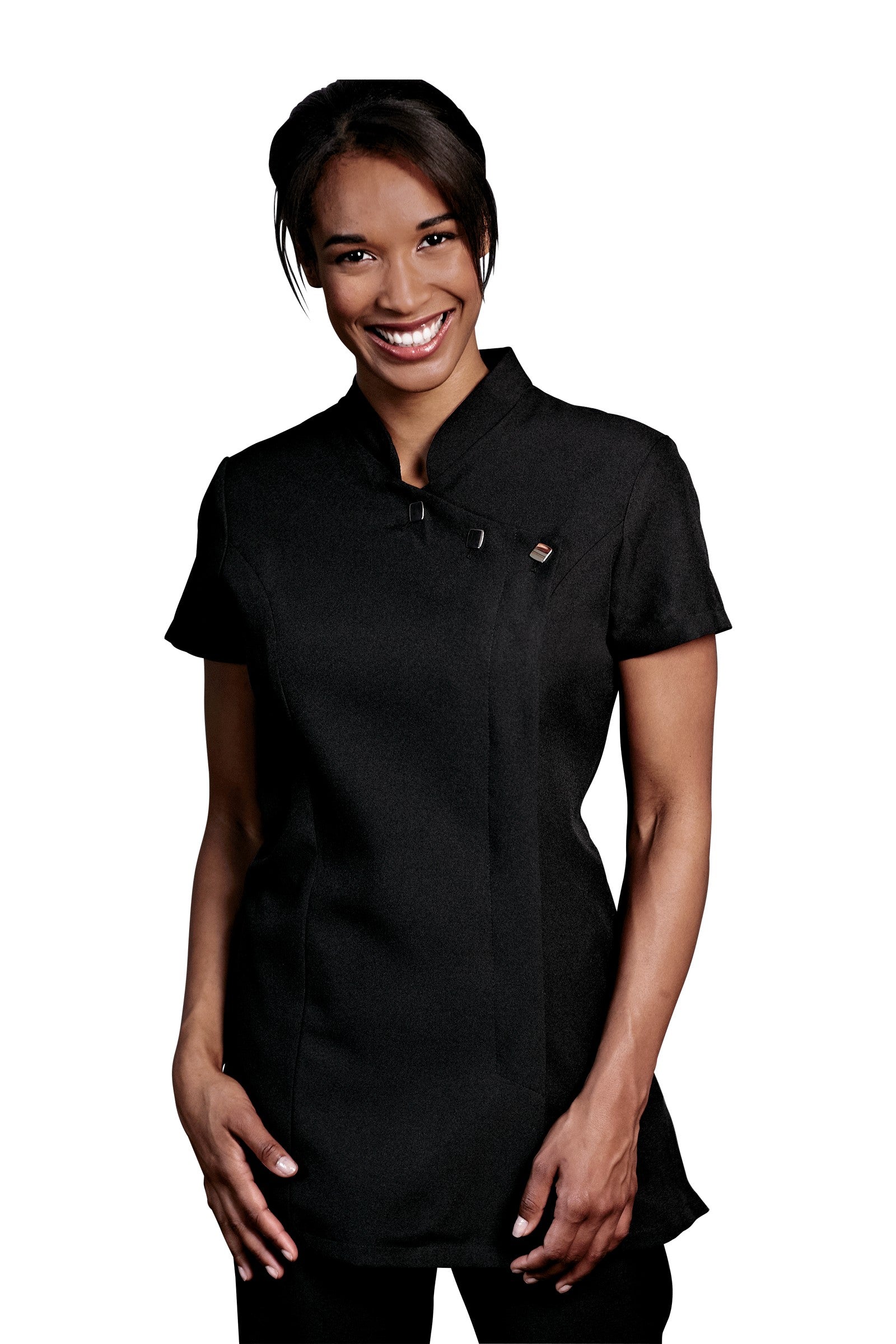 Ladies asymmetrical tunic. Short sleeves fitted standcollar front side button fastening 2 side pockets Side slits Comfort pleat in back armhole in anti perspirant coolmax fabric