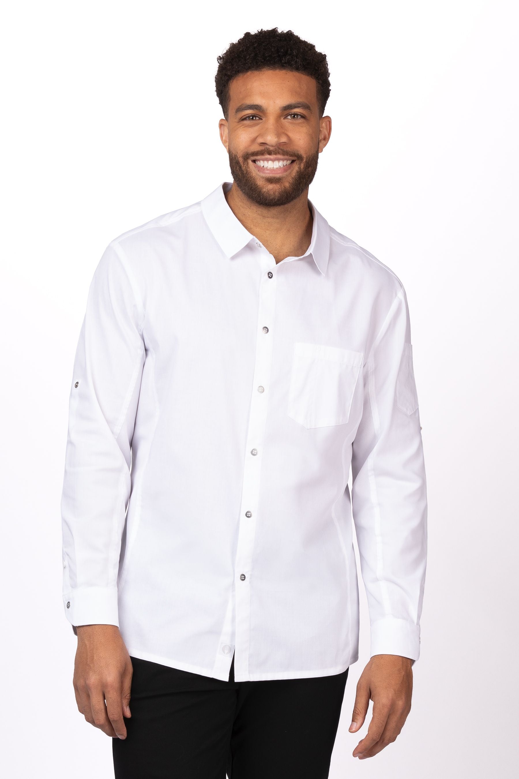 Size GuideWhether you’re in the kitchen or in the office, show them you mean business. Cool Vent side panels keep you cool, no matter what the day brings. This shirt features a front pocket with a pencil divide, along with a left sleeve thermometer pocket. Comes in black, blue, gray, and white